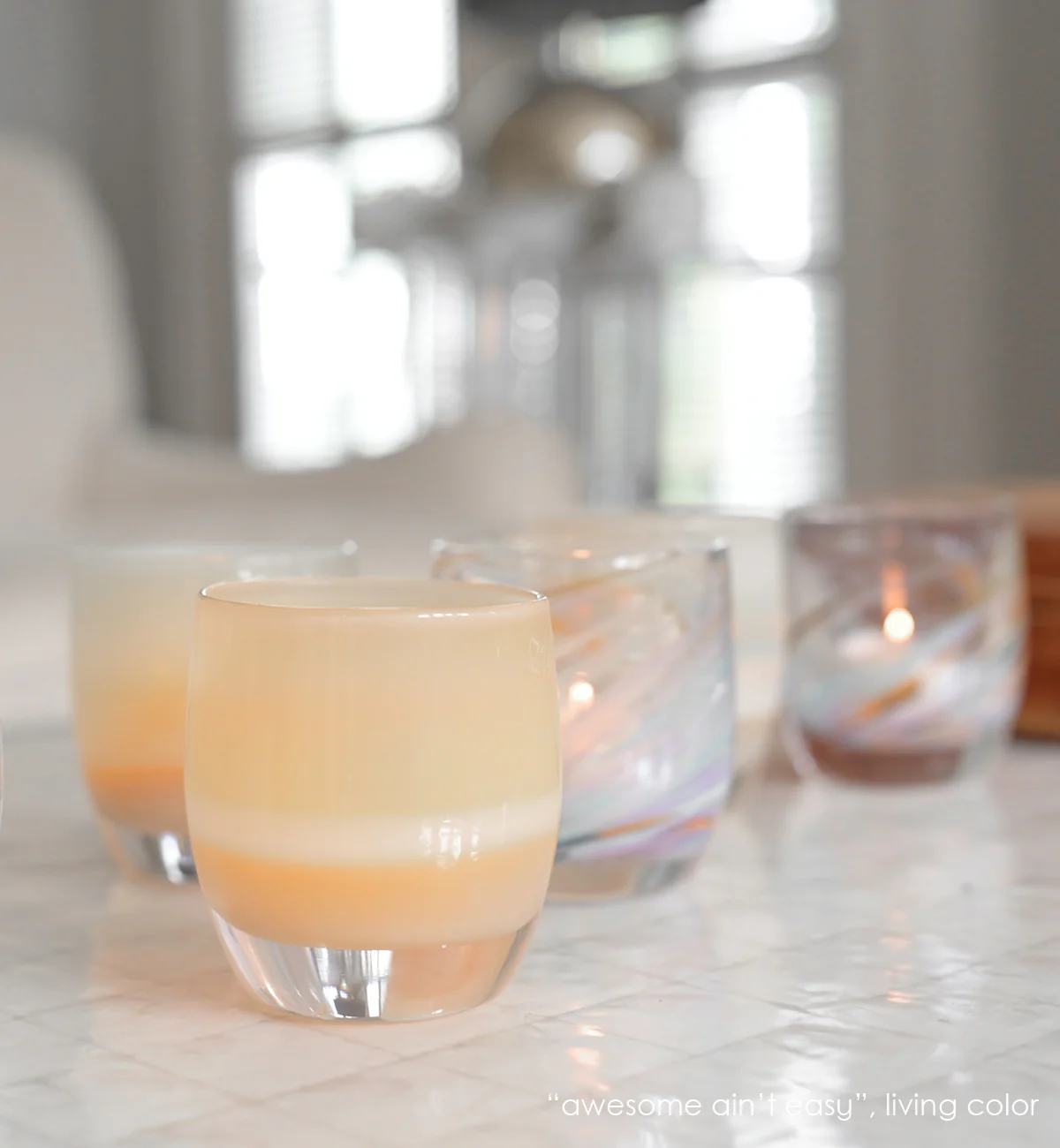 Impressively strong, yet refreshingly human. Each unique piece will glow in a color somewhere between yellow and peach, with a band of light or dark across the waist.