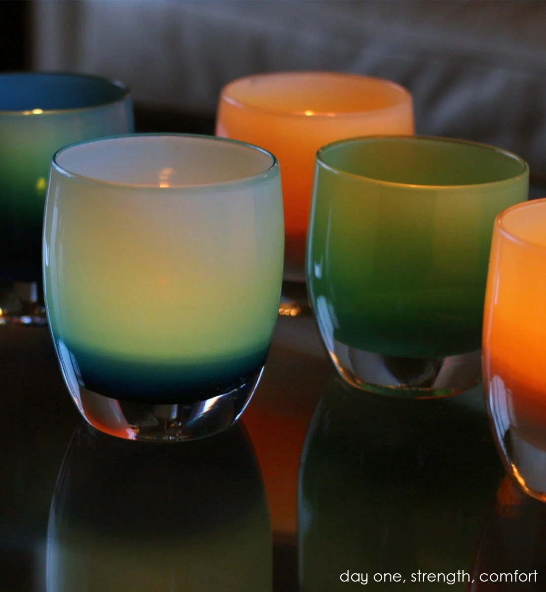 a double overlay technique is used to create this glassybaby. two colors are layered on top of each other to create a beautiful depth. a bright white is covered by a deep blue to create this one-of-a-kind shade.